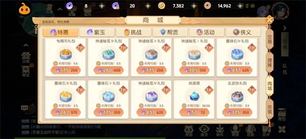 帮贡商城里的修炼丹和铜币袋现在打五折,推荐大家入手;另外提升伙伴好感度的烹饪道具,每周一定要全部买完,这能有效增强伙伴的战斗力。