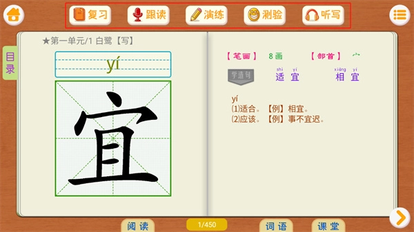 上方设有复习、跟读、演练、测验及听写功能,用户可依据自身需求自由选择使用。