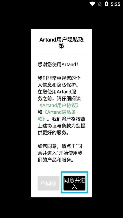 在itmop安卓网中打开Artand应用,仔细阅读弹出窗口里的内容后,点击【同意并进入】按钮。