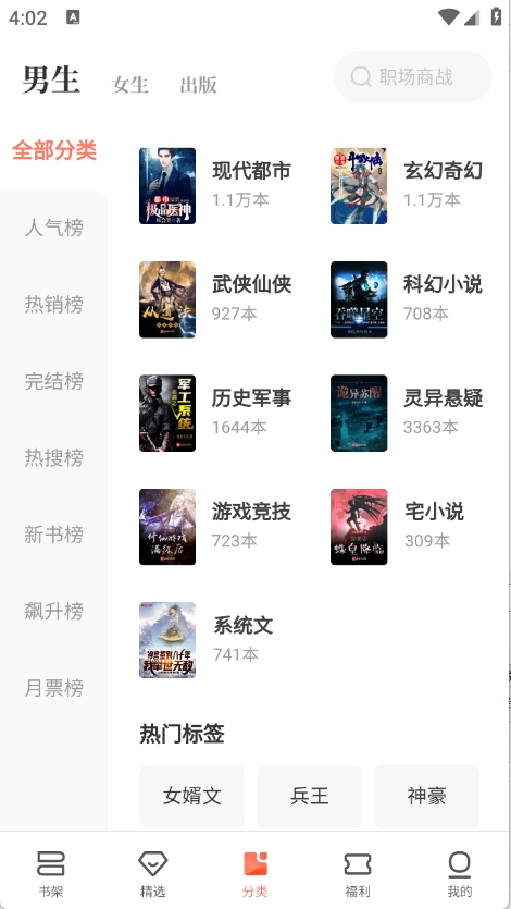分类页面对小说做了细致的分类,涵盖言情、悬疑、武侠等各类题材。