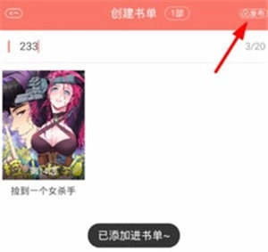 可以通过已订阅的漫画,或者直接搜索漫画名称的方式来添加,添加完成后,点击右上角的“发布”按钮,就能成功创建书单了。