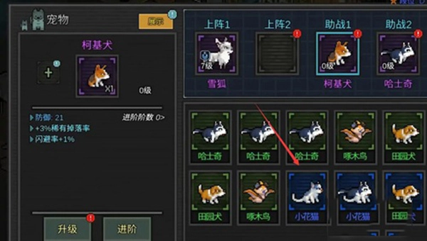 进入宠物界面后,我们点击选中一只未上阵的宠物,这里就以【小花猫】来举例说明。