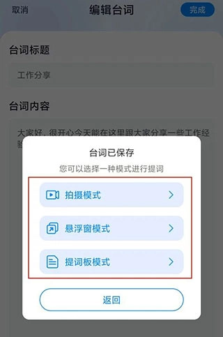 步骤三、接下来会弹出“台词已保存”的提示窗口,同时提供拍摄、悬浮窗、提词板三种不同的提词模式,大家可以根据自身的实际需求来选择合适的模式;