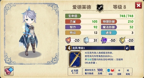 技能特点:掌握技能“北风”(等级1),该技能需消耗4点能量,释放后可对范围内的敌人造成魔法伤害,同时将范围内所有角色牵引至中心位置,并且在范围区域的四个角落生成4道冰刺(冻结效果无纯水伤害)。在属性方面,爱德莱德的力量与物理防御数值较为突出,能够在战斗中兼顾部分近战输出任务与前排承受伤害的职责;其技能“北风”兼具控制与伤害属性,既能聚拢敌人又能造成伤害,在团队作战场景中可以与队友协同配合,从而提升整体输出效率。