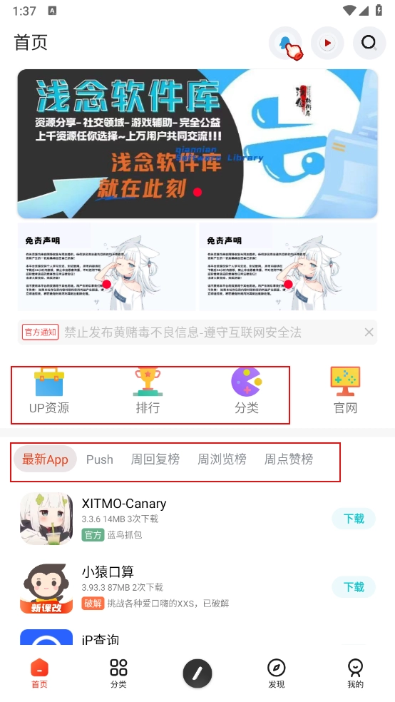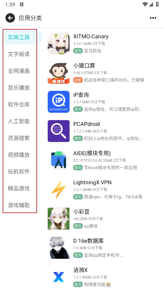 点击"分类"进入,有各个软件资源和精品游戏等。