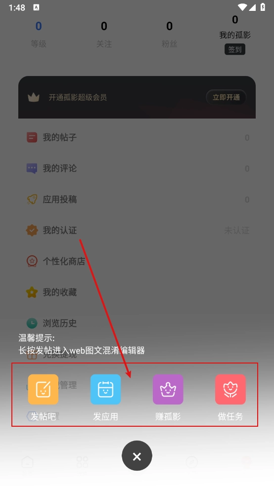 最后点击中间的发布图标,还能进行发帖、发布应用以及赚取孤影等操作。