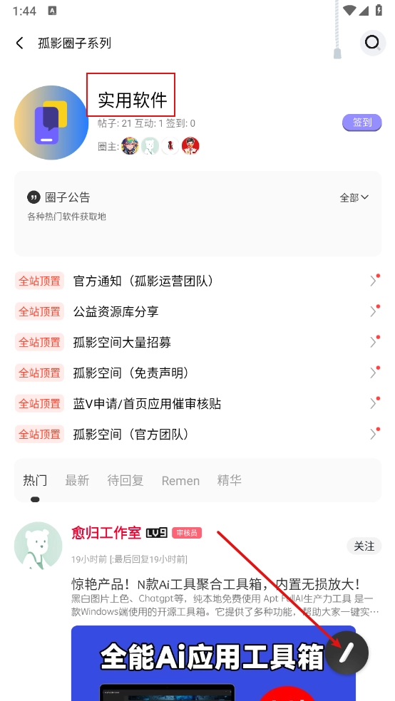比如进入实用软件社区,点击右下角的发布图标就能发布帖子。