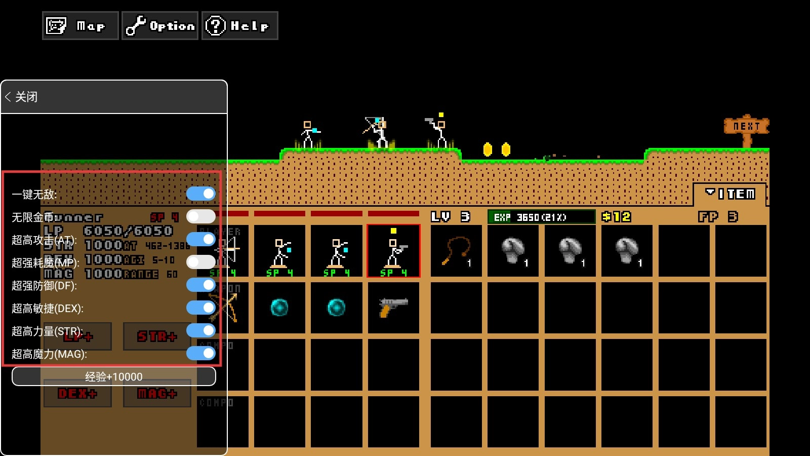 开启【一键无敌】等辅助功能,调整角色属性提升战力,轻松应对困难关卡,畅享冒险体验。