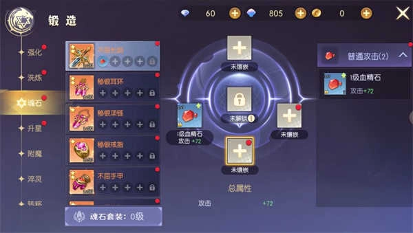 接下来是镶嵌魂石的环节,每件装备都能镶嵌5枚魂石,分别对应提升攻击力的血晶石、增加破甲值的紫光石、强化生命值的翡翠石,以及提升防御的金刚石。在这四种属性里,建议优先选择并升级加攻击力的石头,其次是生命值相关的,之后再考虑破甲和防御类的。除了通过购买获取更多魂石外,还可以提升魂石等级——相同等级的同名魂石能够合成更高级的,其属性会有显著提升。