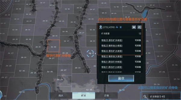 玩家能够查看地图上的矿区分布、联盟占领状态,搜索对应等级的矿点,还能查看各个矿区详细的可开采信息等内容。