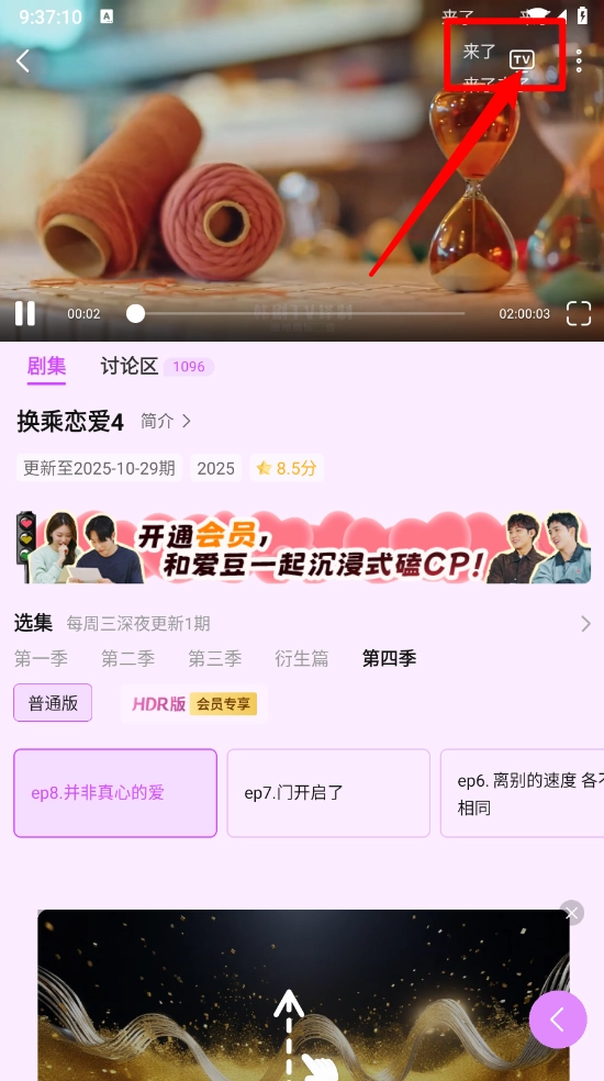 一键开启后进入播放详情页面,点击右上角的“tv”标识。