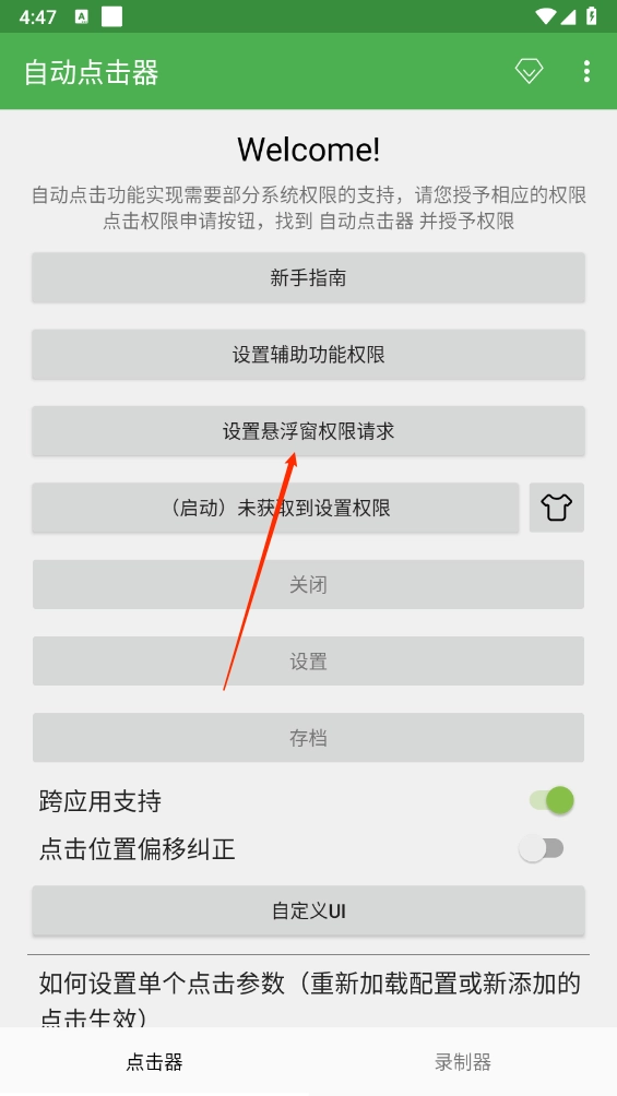 请先在本站完成软件安装,随后进入主页,点击“设置辅助功能权限”选项进入相关页面。