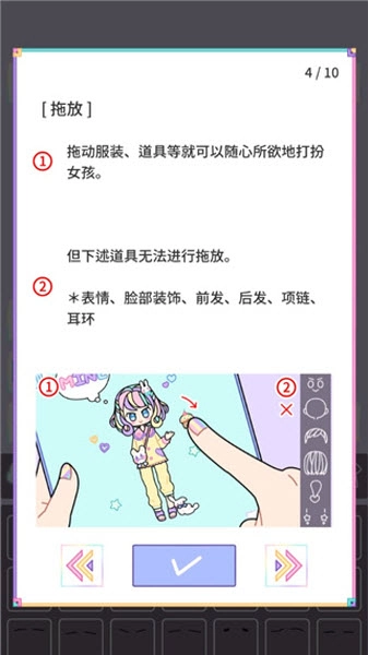 在粉彩女孩里,你可以通过拖放服装和道具的方式,自由地为女孩进行装扮。不过需要注意的是,以下这些道具是不能拖放的:表情、脸部装饰、前发、后发、项链、耳环。