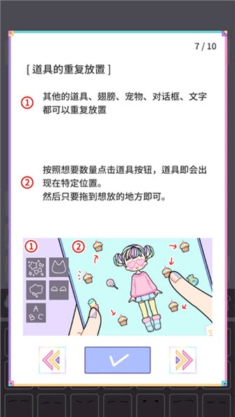 在粉彩女孩里,其他各类道具、翅膀、宠物、对话框以及文字等元素都支持重复放置。操作时,只需按照你期望的数量点击对应的道具按钮,该道具就会出现在特定的初始位置,之后你只需将其拖拽到想要放置的地方即可。