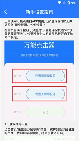 进入新手指南,按照步骤打开悬浮窗与无障碍服务的使用开关。