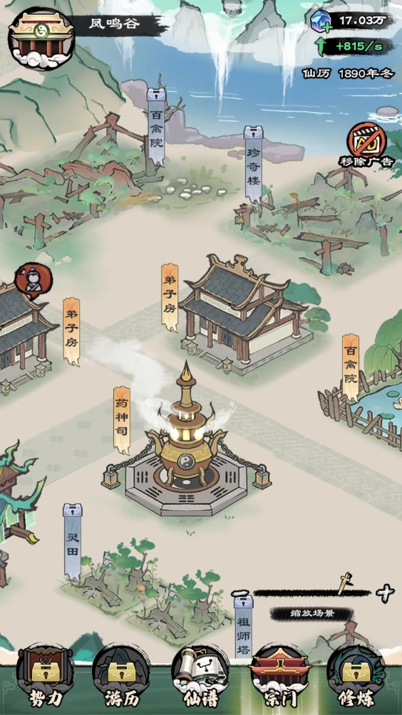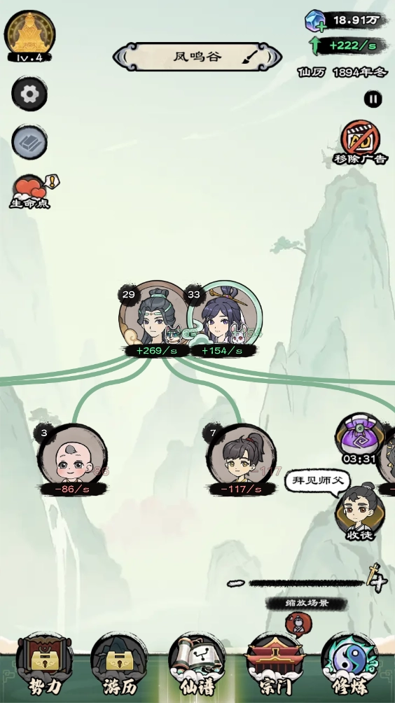 宗门系统在等级达到3级时解锁,解锁后可在此处建造各类设施,并安排弟子入驻进行修炼。