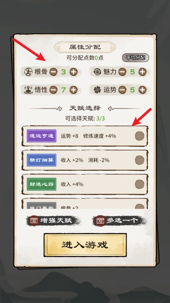 在游戏正式开始前,你可以先为自身的各项属性分配点数,接着挑选合适的天赋,之后就能开启游戏了。