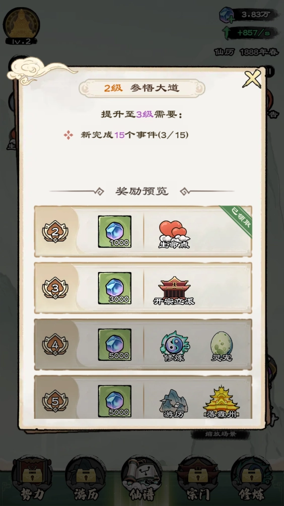 通过修炼,我们能持续参悟大道,提升自身的大道等级,进而解锁更多功能。