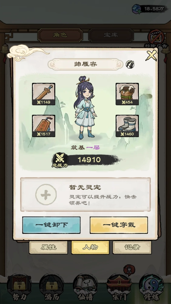 装备系统:弟子的实力能够通过战斗获取或在灵宝店购买装备来提升。