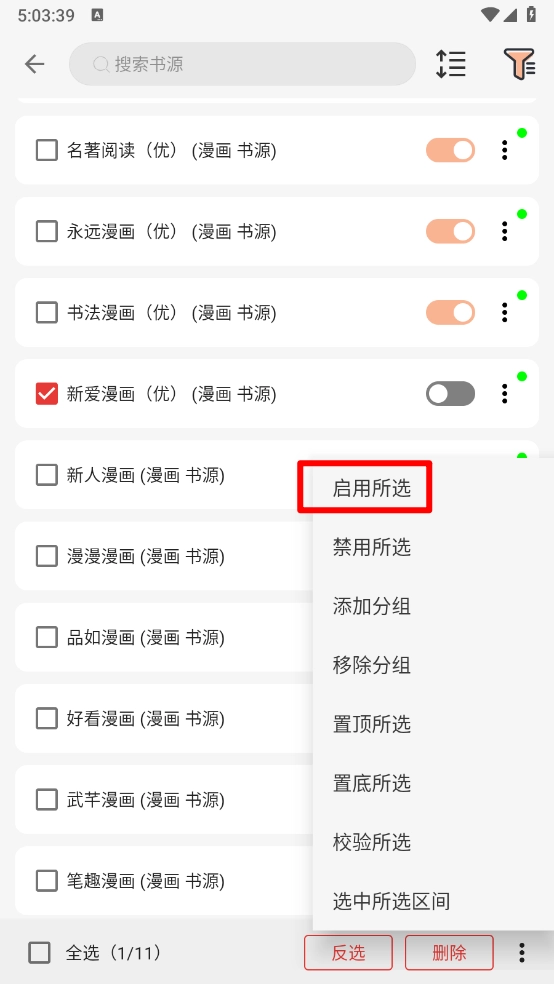 如图所示,能看到多个漫画源,勾选需要开启的漫画源后,点击右下角的三个点图标即可。