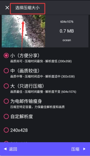 一键开启视频,挑选压缩尺寸,提供多种预设方案,能依据需求选择压缩方式。