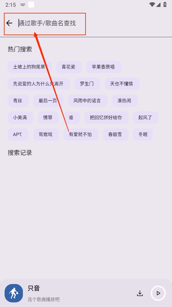 你也可以点击主页上方的搜索框,输入歌手名字或者歌曲名称来进行查找。