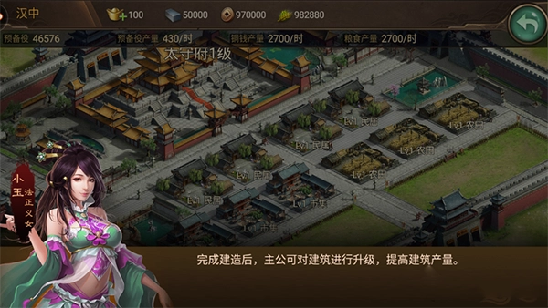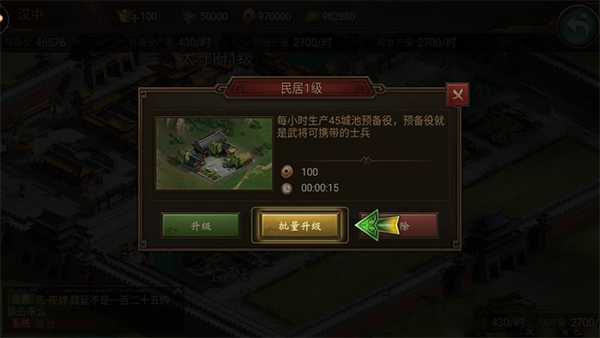 进入游戏后,首要任务是发展自身城池。第一步得先建造民居,民居能够产出预备役,而预备役是武将所率领的士兵,属于最基础的兵种,所以需要大量生产。