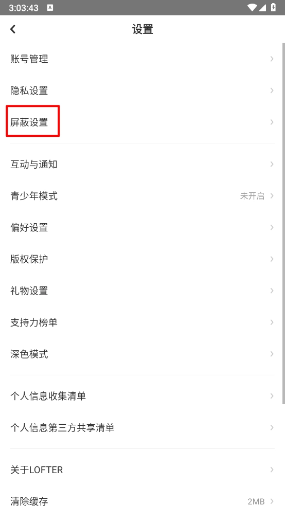 接着在屏蔽设置页面点击"标签屏蔽管理"。