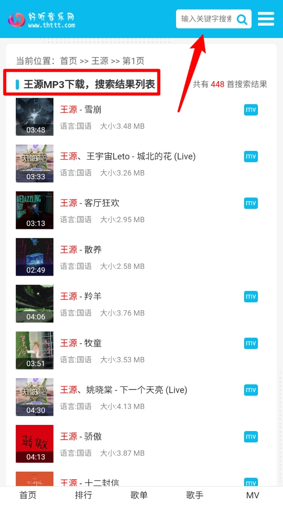 还可以在搜索框,输入歌手的名称查看歌曲。