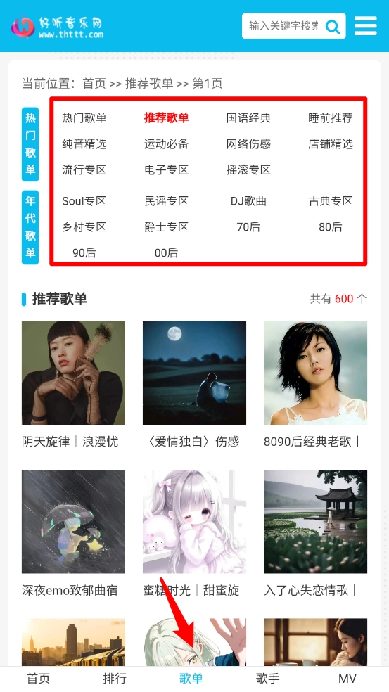 进入歌单板块,可以根据分类选择喜欢的歌曲畅听。