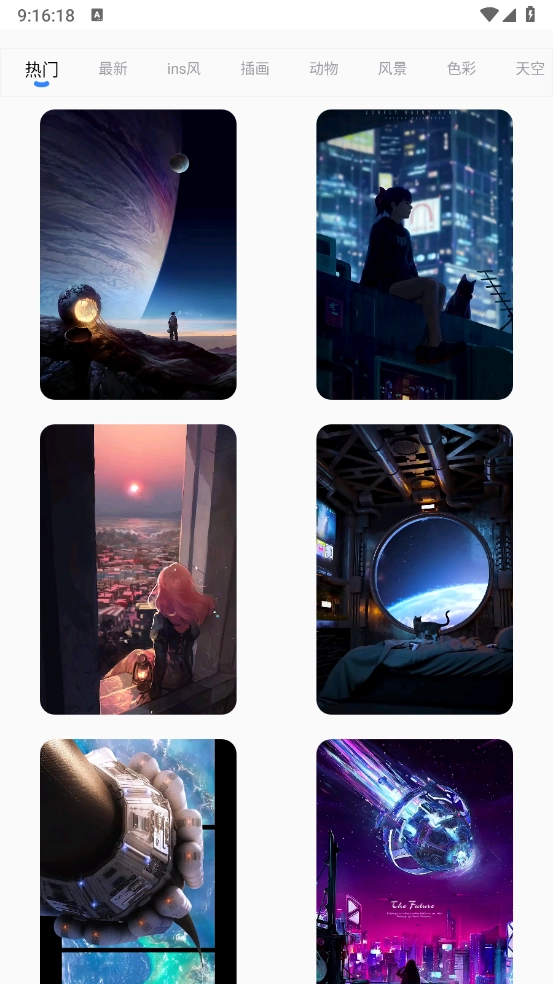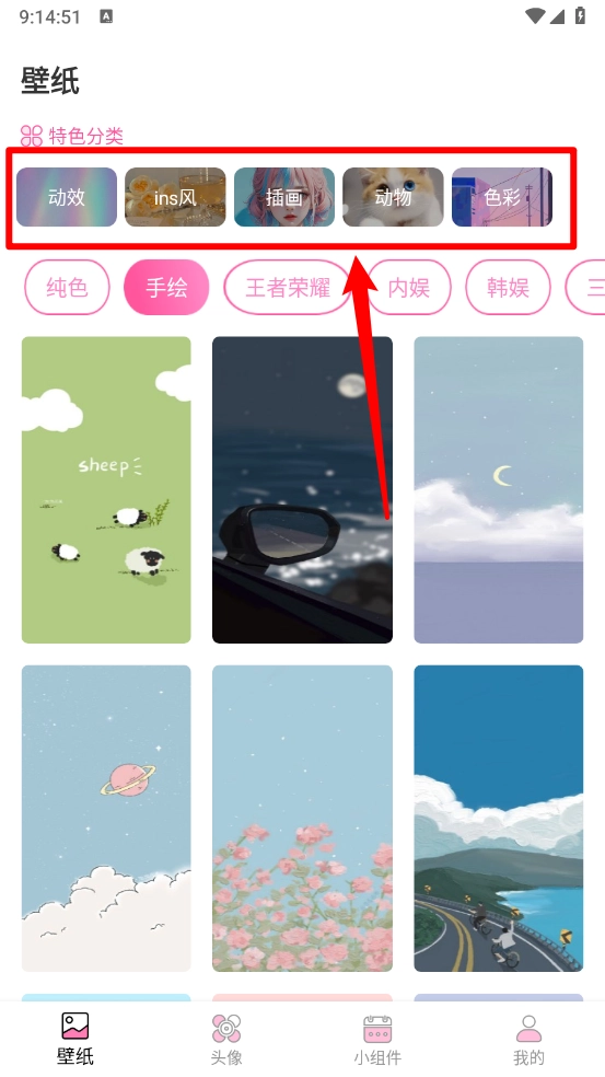 在壁纸页面,您可以通过滑动来挑选心仪的壁纸,也能按照特色分类进行选择。