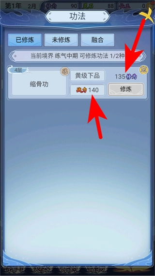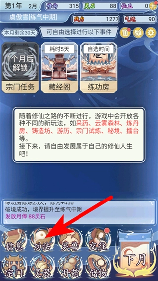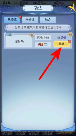 在修仙主界面,点击功法选项,进入功法修炼的页面。