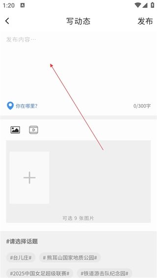 在撰写动态页面时,输入要发布的内容、挑选相关话题并上传图片,之后点击【发布】按钮,就能完成动态的发布流程。