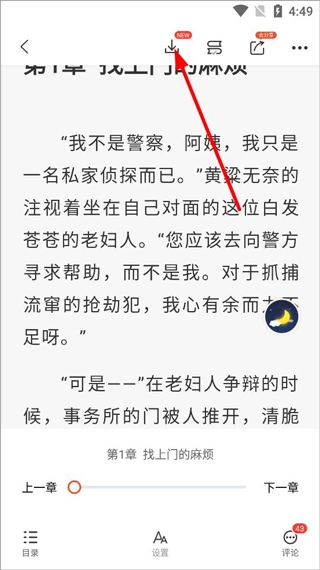 2、打开需要的小说,点击页面,上方出现标识,点击即可;