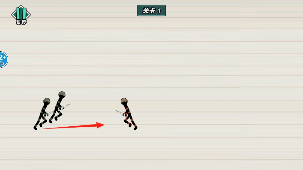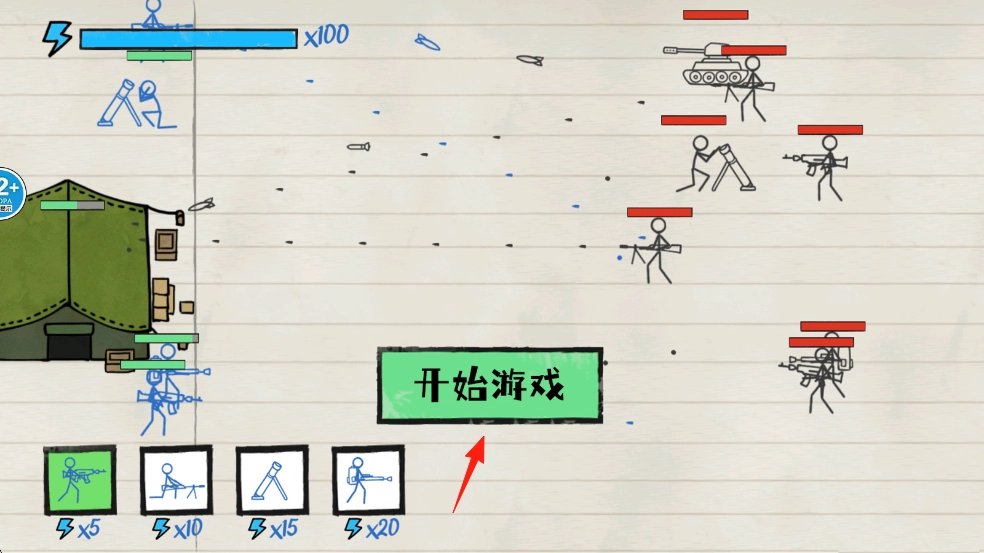按照“关卡1”的布局,先确认士兵已完成招募(红箭头所指),接着点击【开战】按钮,即可触发火柴人之间的对战。