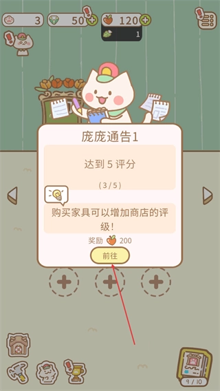 持续购买装饰提升店铺评分,完成通告目标后领取200奖励以推进游戏。