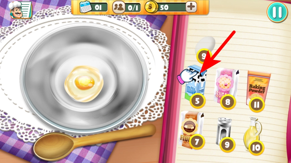 在调配蛋糕原料时,点击右侧食材栏里的牛奶,把它添加到盛有鸡蛋的容器中。