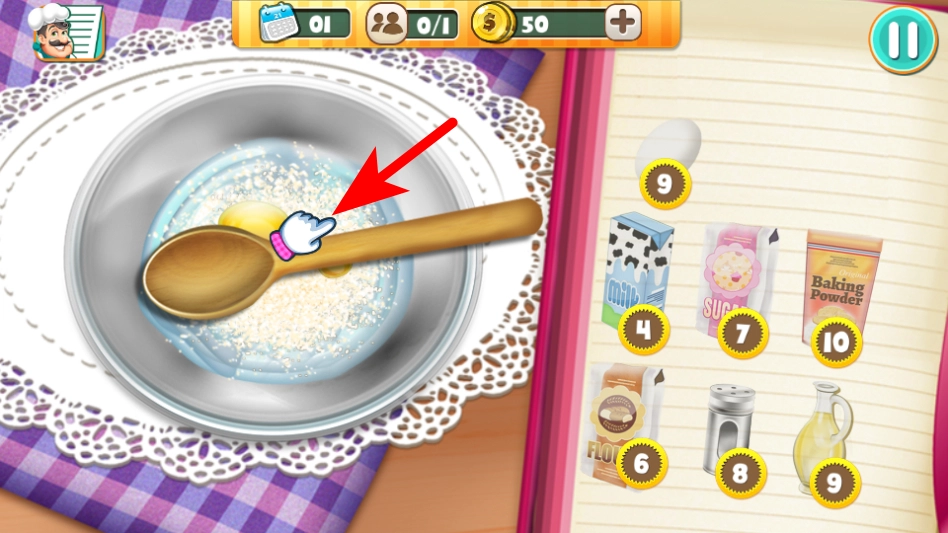 把食材都添加完毕后,点击容器旁边的木勺,就能对容器里的原料进行搅拌混合,这样就完成原料调配了。