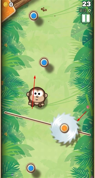 在关卡场景里,你需要操控猴子通过弹射的方式移动,一边躲避障碍,一边收集路上的蓝色道具,以此推动关卡进程。
