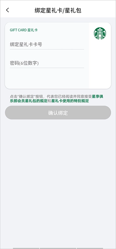 3、输入星礼卡卡号和密码,点击确认绑定就可以啦。