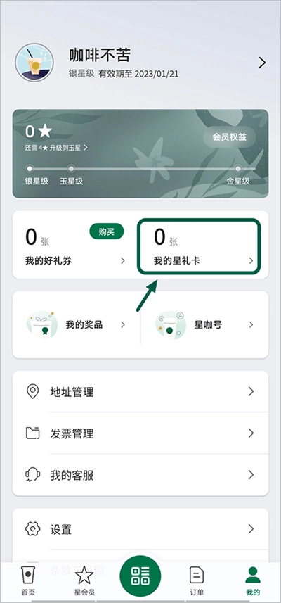 首先打开星巴克应用,进入“我的”页面后,选择“我的星礼卡”选项。