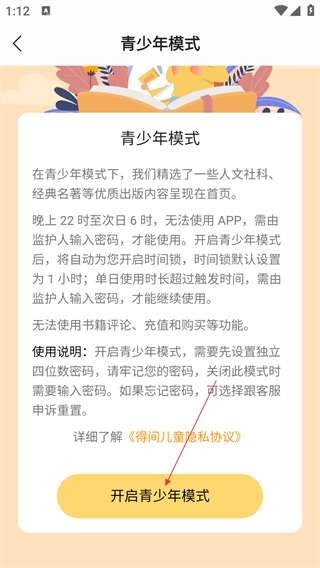 在【青少年模式】页面,点击【开启青少年模式】按钮,就能启用该模式,从而为青少年营造健康的阅读环境。