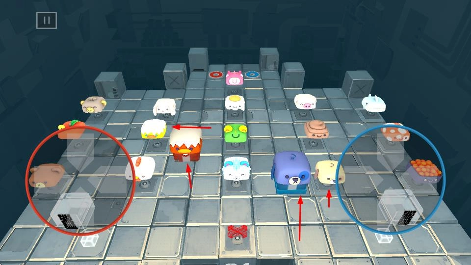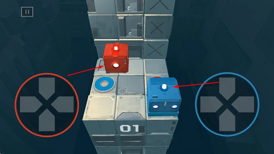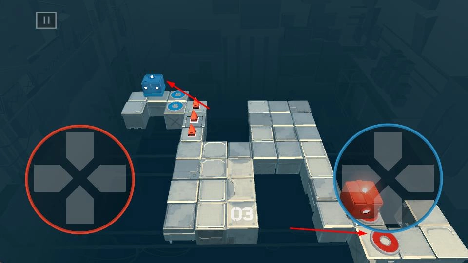 在关卡里,你可以使用左边的红色十字键来控制红色方块移动,右边的蓝色十字键来控制蓝色方块移动,需要规划合理的路径,让这两个方块分别到达和它们颜色对应的目标区域。