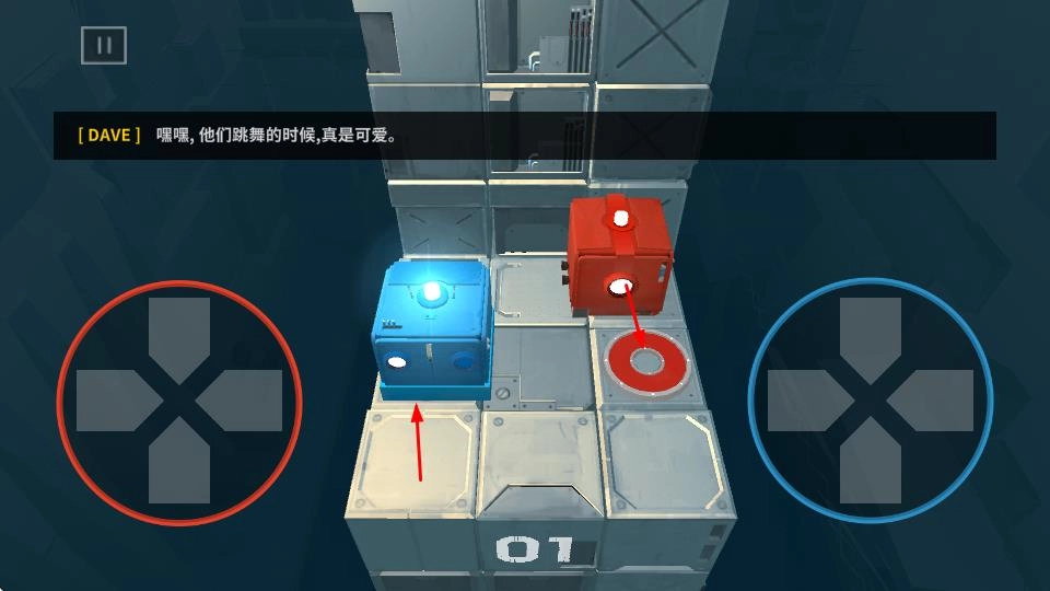 按照指引完成基础移动操作,像让蓝色方块、红色方块先后抵达指定位置,期间会穿插剧情对话,为游戏增添趣味。
