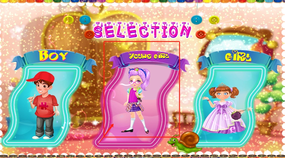 在红框区域内选择那位佩戴眼镜、身着格子裙的年轻女孩角色,其左右两侧还分别有男孩和公主角色可供挑选。