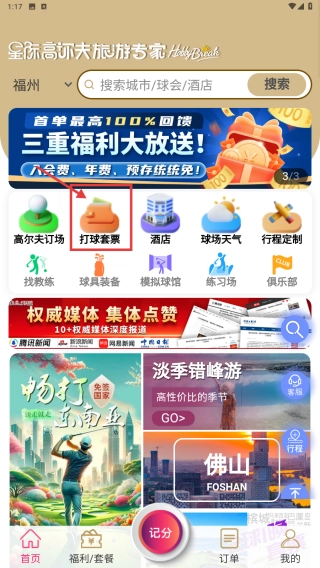 打开高尔夫旅游服务类应用,点击打球套票选项,进入精选打球行程页面。
