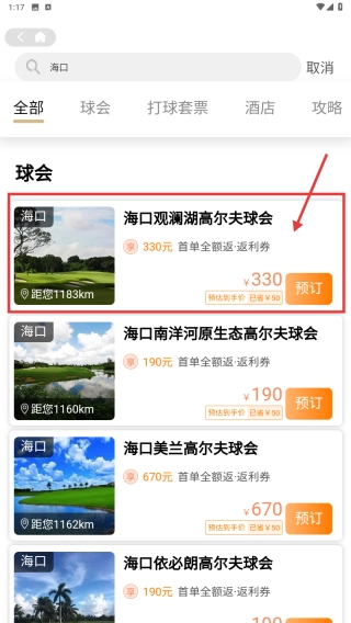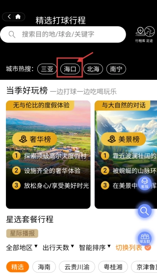 在精选打球行程页面,选择海口城市,进入海口高尔夫球会列表页面。