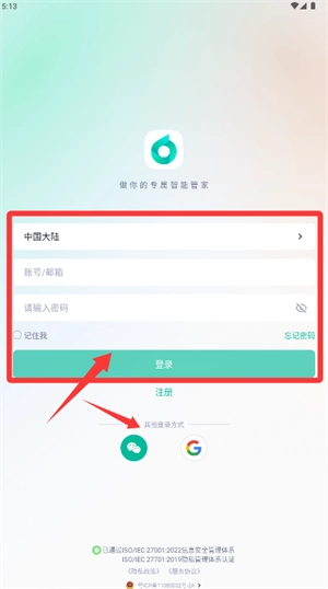 在登录界面选择所在地区,填写账号密码或选用其他登录方式。