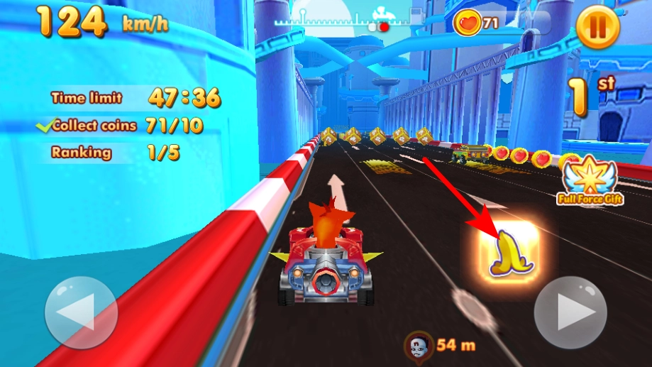 按照指引,驾驶赛车收集赛道上的香蕉道具,这个道具能够对后方车辆产生干扰,助力提高自身名次。