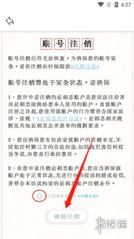 先查看账号注销的相关信息,在确认所有内容准确无误后,勾选“我同意”选项,接着点击“继续注销”按钮。